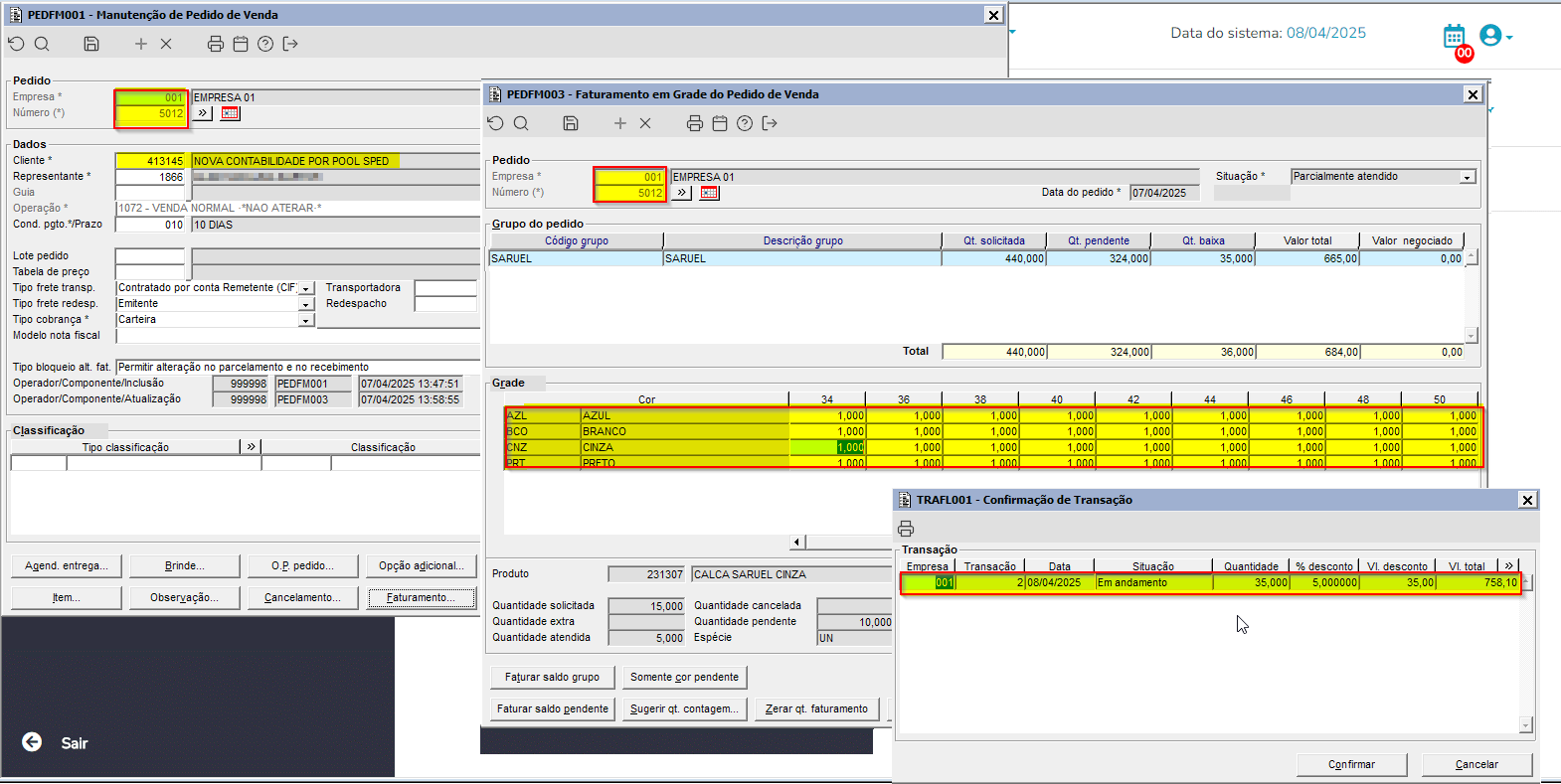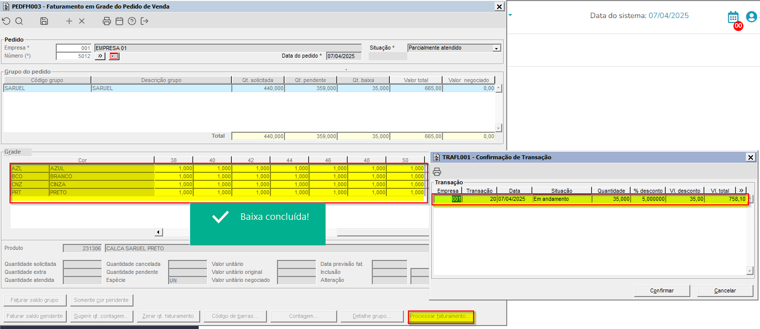 Imagem 11 - Demonstração no PEDFM003 de Faturamento em Grade de Pedido de Venda, para o pedido = 5012, para vários produtos , sendo 35 itens com quantidade = 1 para cada item e com o valor de 758,10 na confirmação da Transação