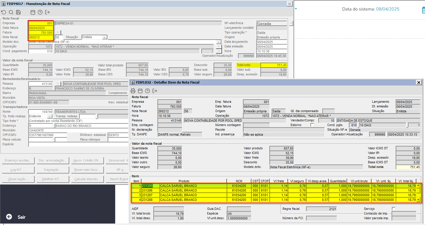 Imagem 13 - Demonstração no de Continuação de Transação de Venda, com o encerramento da venda no TRAFM061 e com o recebimento no TRAFM066 utilizando o parâmetro IN_RECALCULA_VLPRD_NF = 1 para transação= 20 com 35 itens recebidos.