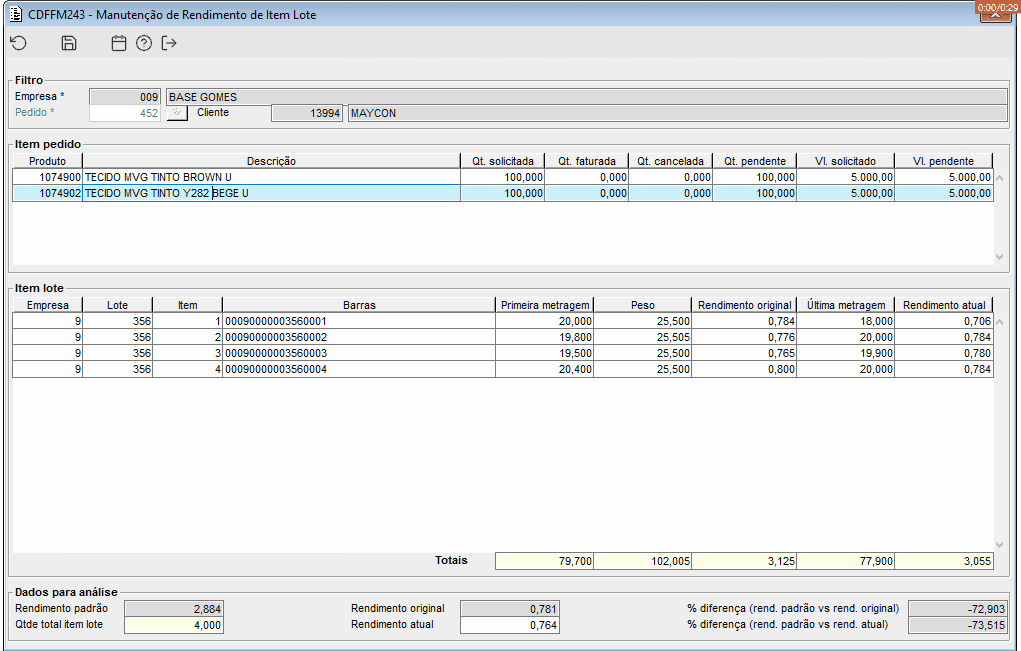 GIF 4 - No componente CDFFM243, foi ajustado cálculo dos campos de % de diferença para (rendimento original - rendimento padrão) / rendimento padrão * 100) e ((rendimento atual - rendimento padrão) /rendimento padrão * 100).