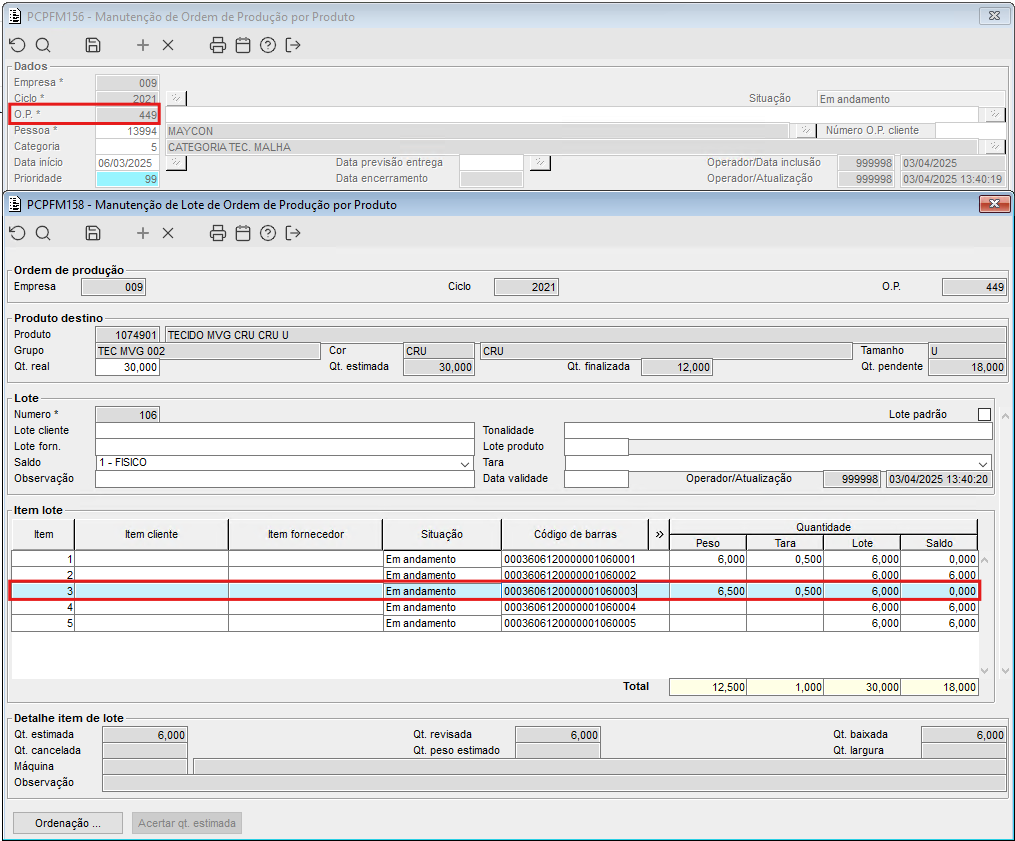 Imagem 2 - Componente PCPFM158, exibindo item 3 da O.P. componente 449 que foi finalizado.