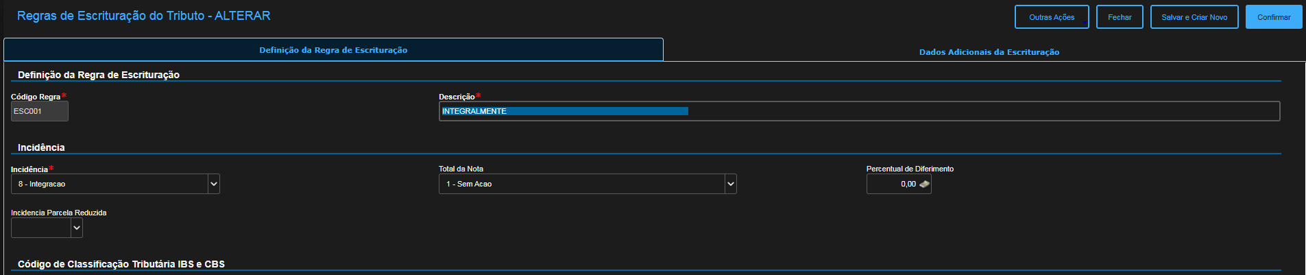 Para que a regra de escrituração receba dados por integração é necessário selecionar a opção 8 - Integração no campo de incidência.