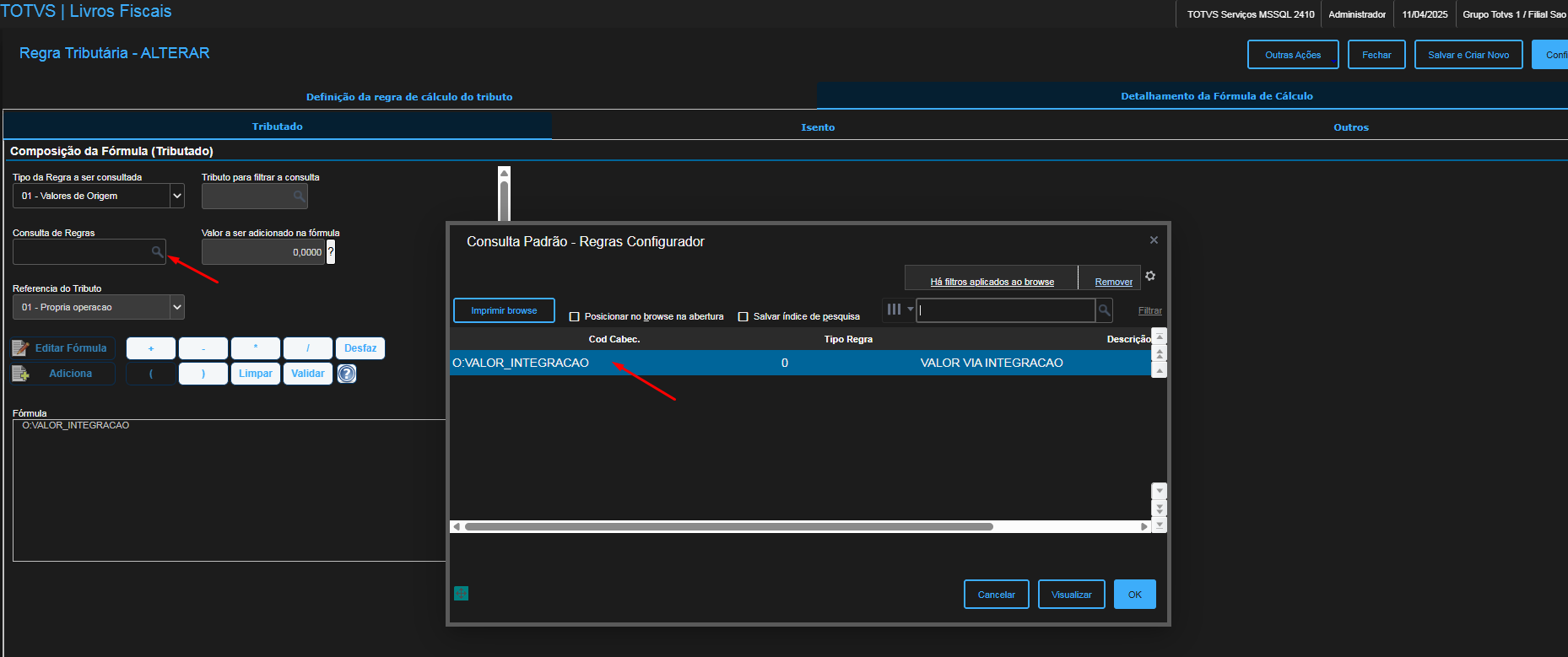 Crie uma regra de alíquota utilizando as regras de base e alíquota criadas anteriormente, e na fórmula de cálculo, clique para desfazer tudo, e então adicione o operando "O:VALOR_INTEGRACAO". Então termine de preencher os perfis dentro da regra de cálculo conforme sua operação.