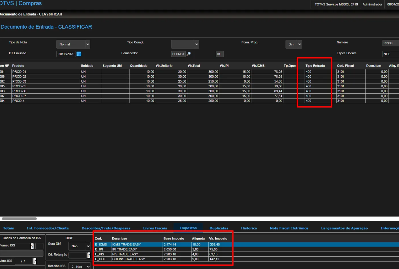 Após digitar a TES (Necessário apenas para o configurador saber qual o CFOP da Operação), os tributos via configurador de tributos aparecem: