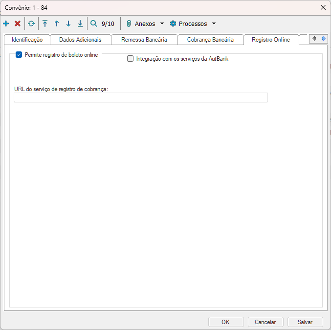 - URL do serviço de registro do boleto: Deve ser informada a URL do serviço de registro do boleto disponibilizada pelo banco.