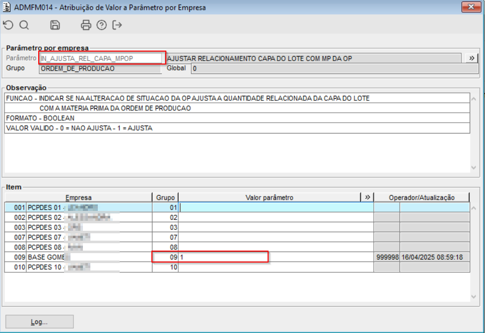 Imagem 01 - Parâmetro configurado como 1 para realizar o ajuste da quantidade relacionada com base no consumo da produção.