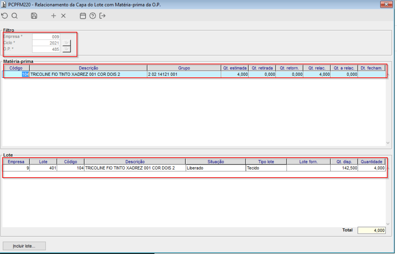 Imagem 02 - Demonstra o relacionamento de capa do lote com a O.P., onde a quantidade estimada de 4 e a quantidade relacionada de 4.