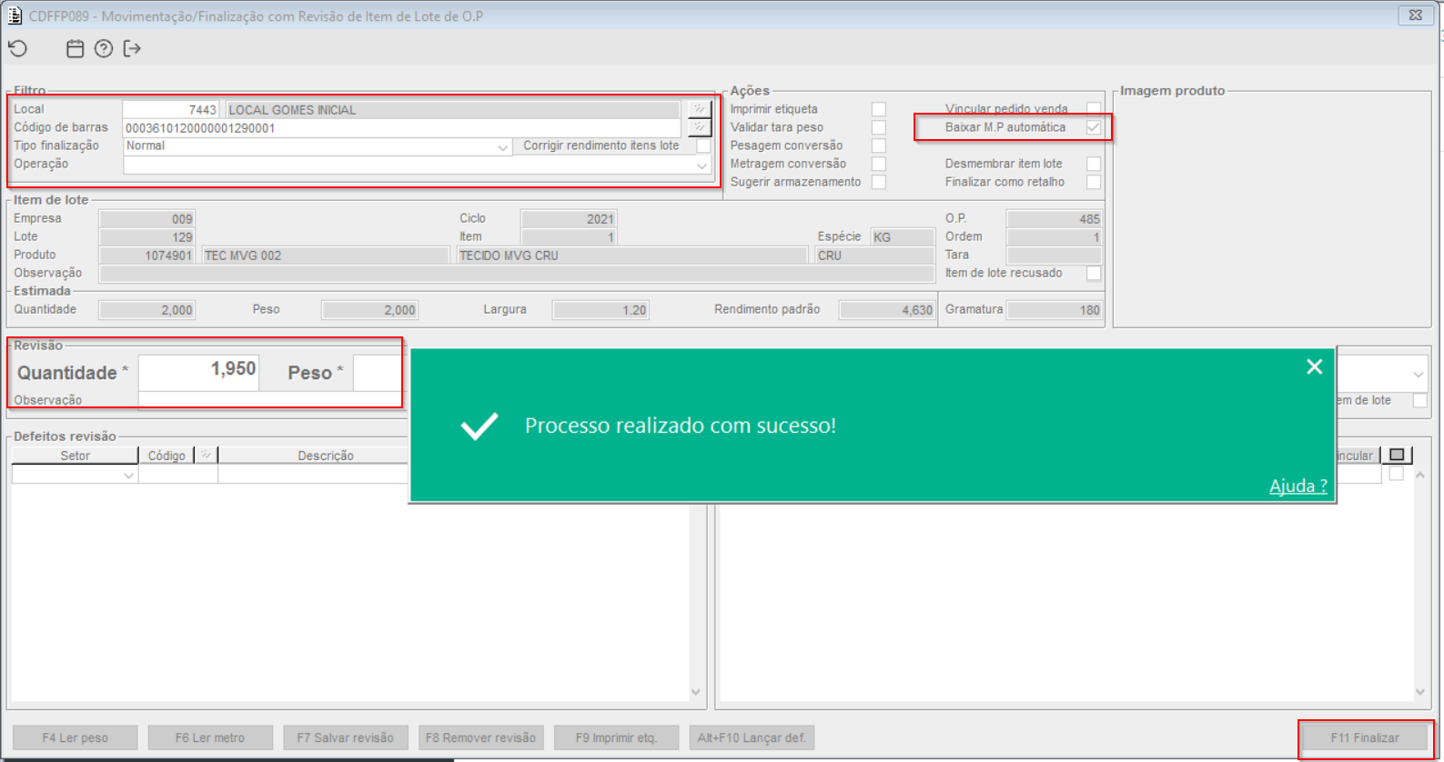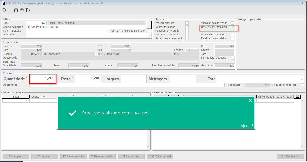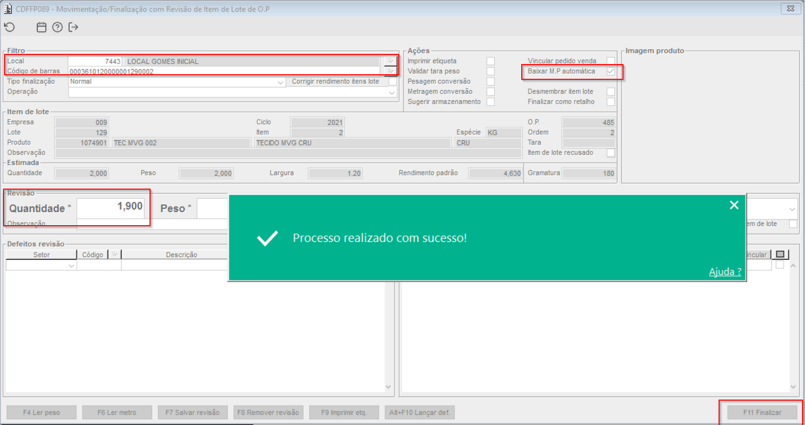 Imagem 05 - Demonstra a finalização parcial do último item de lote da O.P..