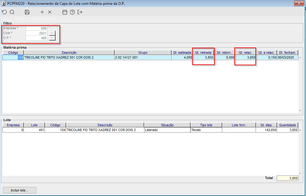Imagem 06 - Demonstra que a quantidade relacionada foi ajustada conforme consumo ocorrido em produção.