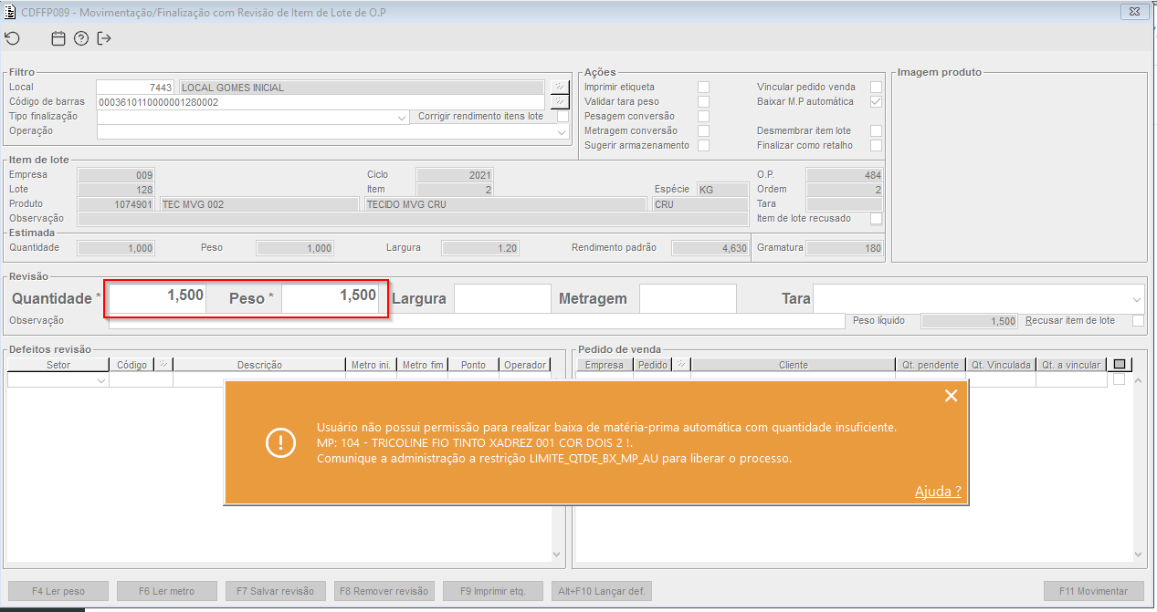 Imagem 05 - Demonstra o funcionamento da restrição, onde é barrado o processo de baixa de M.P. caso o percentual a mais ultrapasse o definido na restrição.