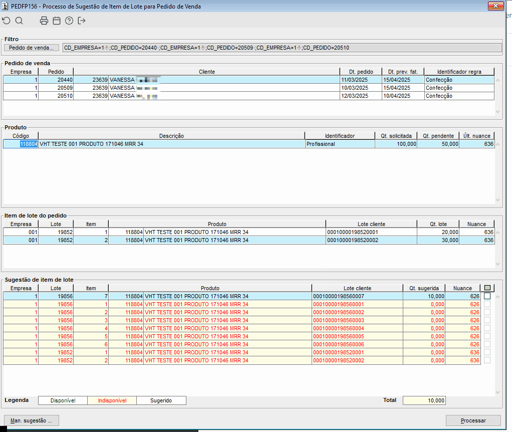 Imagem 02 - Componente PEDFP156 exibindo os itens de lote do pedido com a sugestão de item de lote.