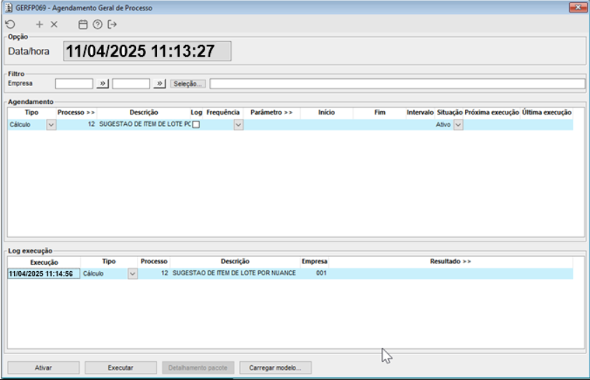 Imagem 01 - Demonstração do componente GERFP069 executando o agendamento geral de processos como tipo "Cálculo" e processo de "Sugestão de item de lote".