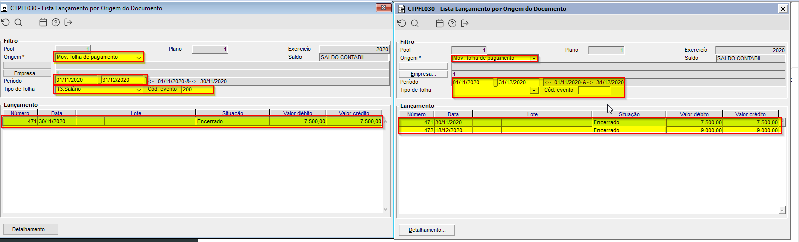 Imagem 2 - Demonstração no CTPFL030 de Lista lançamento por Origem do Documento, com os lançamento de tipo de folha de 13.salario, para o evento 200 e também mostrando a lista quando não inclui o tipo de folha e o código do evento.