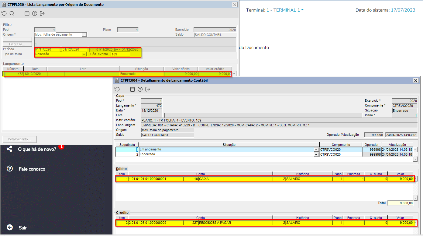 Imagem 3 - Demonstração no CTPFL030 de Lista lançamento por Origem do Documento, com os lançamento de tipo de folha de Rescisão, para o evento 109 e também mostrando o CTPFC004 de Detalhamento de lançamento Contábil com as contas de crédito e debito.