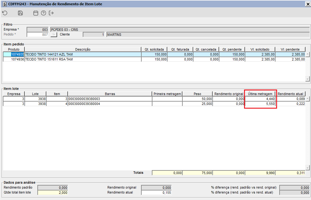 | Função: | CDFFM243 - Manutenção de Rendimento de Item Lote |