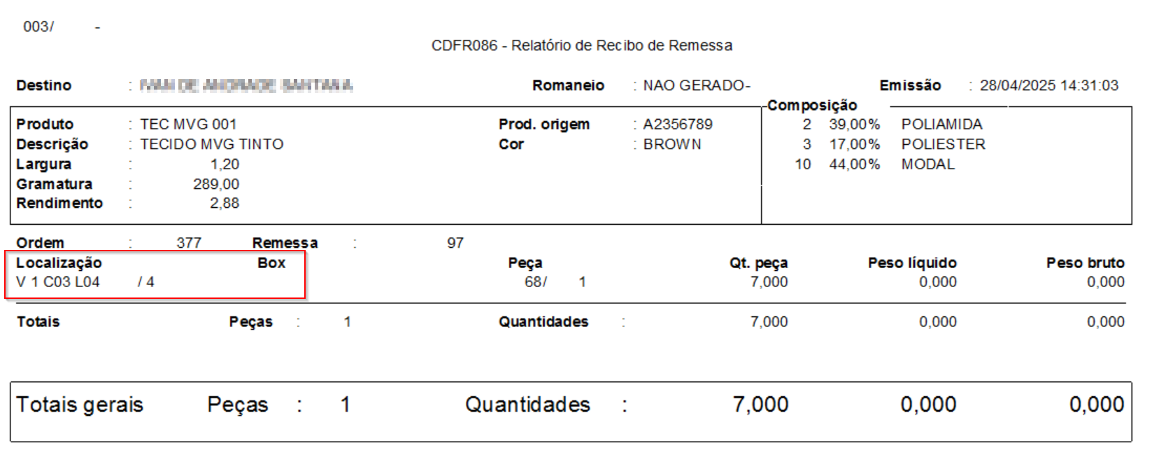 No relatório de Recibo de Remessa (CDFR086) foi incluído a coluna "Localização".