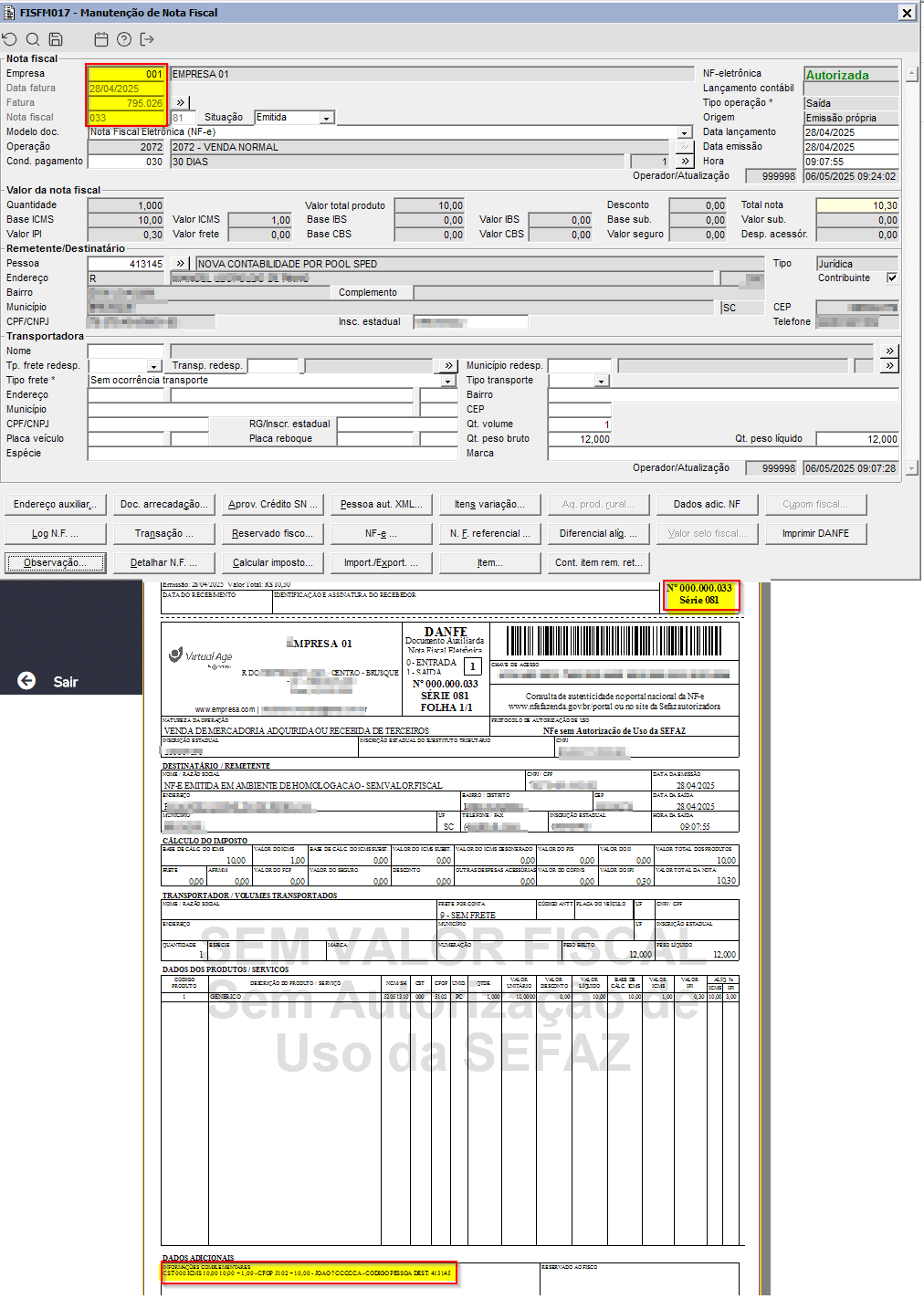 Imagem 4 - Demonstração no FISFM017 de Manutenção de Nota Fiscal, referente a consulta da NF 033, com geração na DANFE a observação para o "CODIGO PESSOA DEST: 413145".