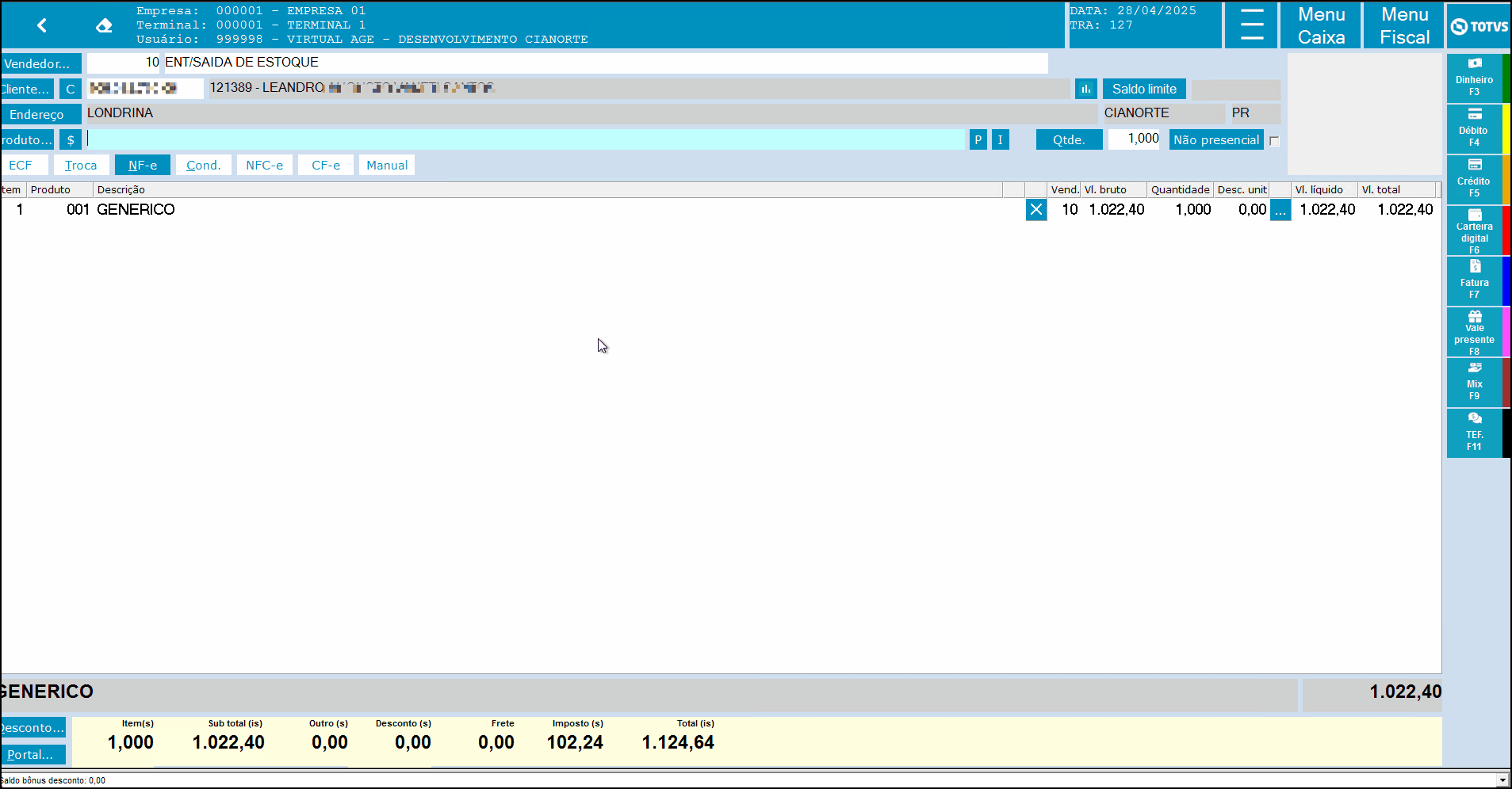 Imagem 03 - Pelo fato da empresa logada possuir um saldo inferior de adiantamento ao valor que foi utilizado na liquidação da transação, pode ser observado que o saldo total de adiantamento da empresa logada foi zerada, e o restante foi retirado da empresa "002" demonstrando que o valor atual de saldo de adiantamento da mesma passou a ser R$ 103,00.
