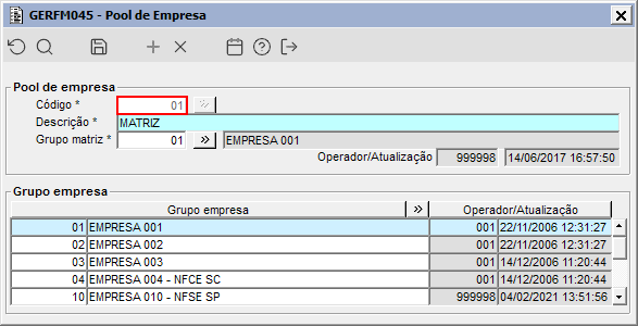 Imagem 02 - Demonstra o componente GERFM045, onde pode ser observada as empresas que fazem parte do pool de empresa "001".