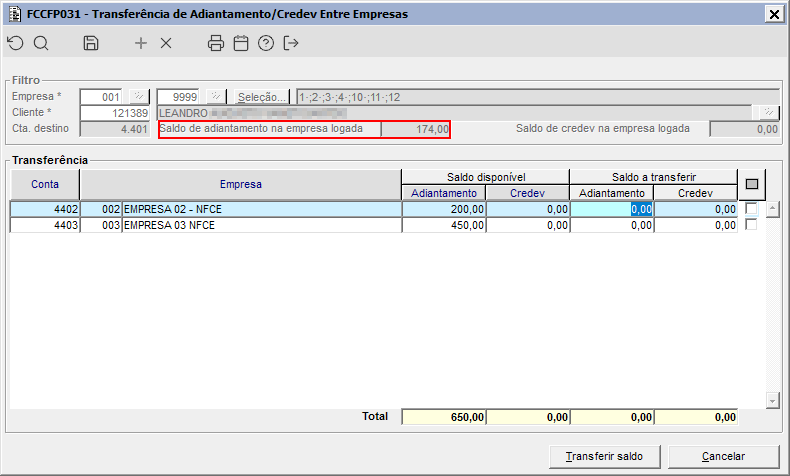 | Função: | Realizar a consolidação de saldo de adiantamento do cliente para todas as empresas e permitir realizar a sua utilização. |