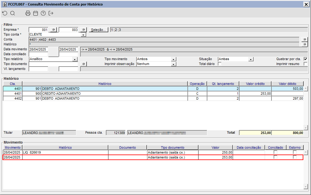 Imagem 07 - Ao consultar a movimentação da conta do cliente através do componente FCCFL007, pode ser observado através do registro destacado, que o adiantamento de R$ 175,00 foi utilizado com sucesso.