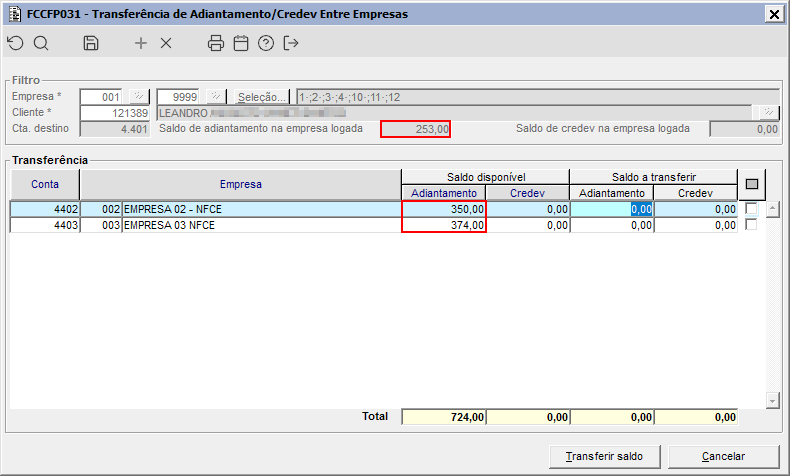 Imagem 01 - Ao consultar o saldo de adiantamento do cliente "121389", através do componente FCCFP031 pode ser observado que o mesmo possui saldo de R$ 253,00 na empresa logada, R$ 350,00 na empresa "002" e R$ 374,00 na empresa "003". Totalizando o saldo de: R$ 977,00 em todas as empresas.