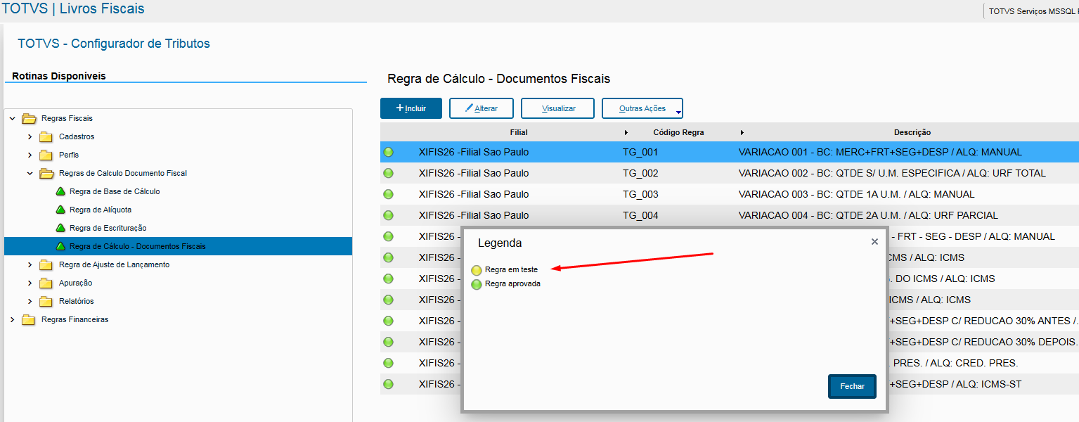Acessando o cadastro de Regra de Cálculo através do Configurador de Tributos poderemos ver que as regras terão uma coluna com uma legenda: