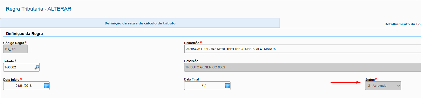 A implementação do mecanismo de aprovação ocorreu na rotina de Cadastro de Regra Tributária (FISA160) com a inclusão de novo campo "Status" (F2B_STATUS).