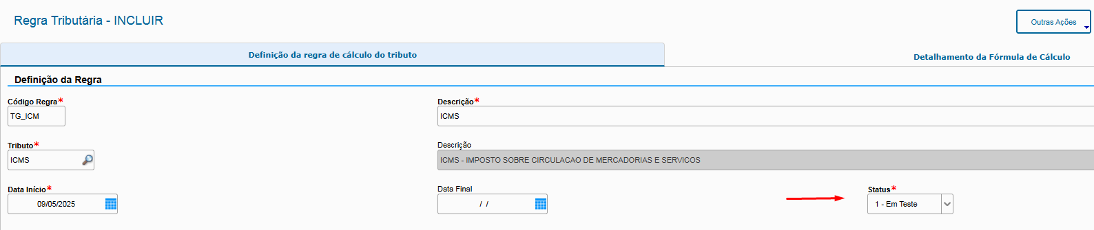 Quando a regra está com o seu status "1 - Em teste" o campo Status ficará aberto para edição.