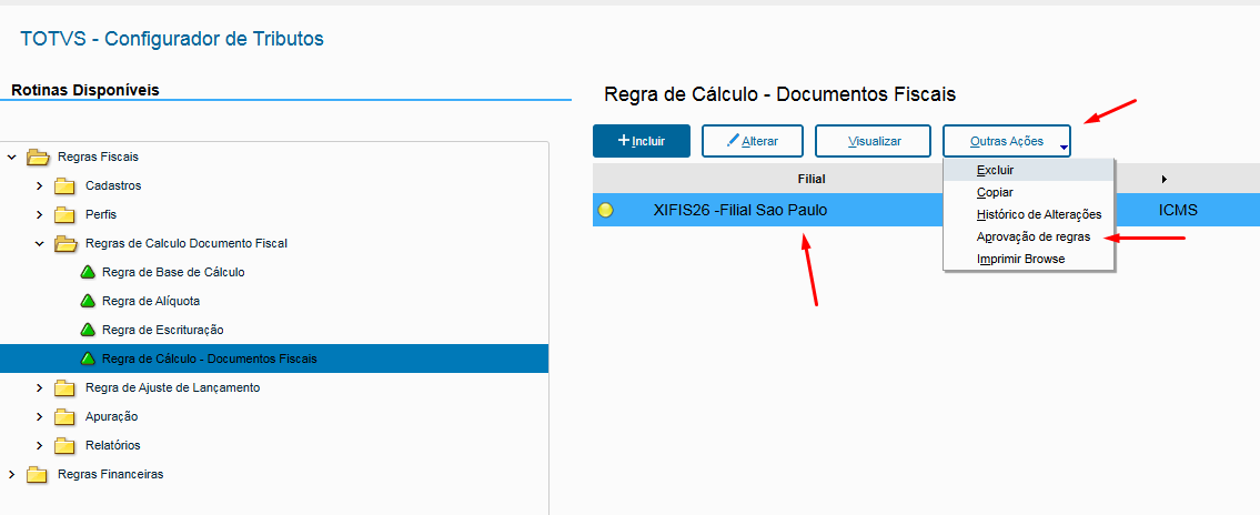 Posicionando na TG_ICM e clicando em "Outras Ações" e depois em "Aprovação de regras" temos o seguinte: