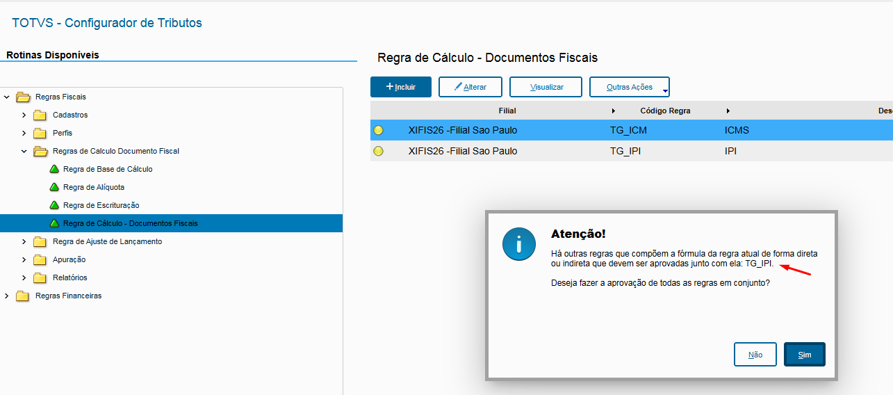 O mesmo não acontecerá se posicionarmos em TG_IPI e fizermos o processo de aprovação. Ela será aprovada e esta janela não aparecerá pois ela não tem em sua fórmula relação com nenhuma outra regra tributária.