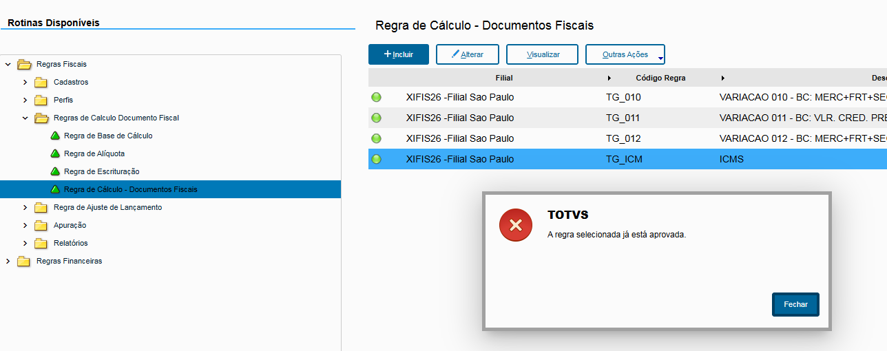 Se tentar aprovar uma regra já aprovada o Sistema retornará a seguinte mensagem: