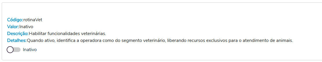 | Detalhes | Quando ativo, identifica a operadora como do segmento veterinário, liberando recursos exclusivos para o atendimento de animais. |