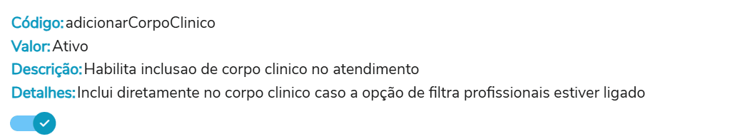 | Descrição | Habilita inclusão de corpo clínico no atendimento |