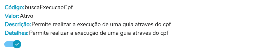 | Detalhes | Permite realizar a execução de uma guia atraves do cpf |