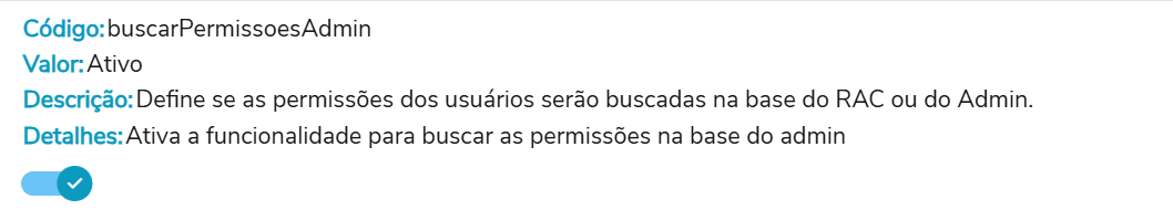 | Detalhes | Ativa a funcionalidade para buscar as permissões na base do admin |