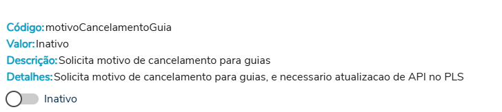 | Detalhes | Solicita motivo de cancelamento para guias, e necessario atualizacao de API no PLS |