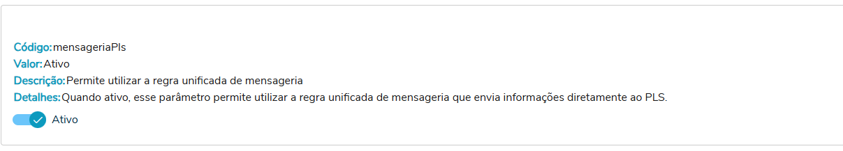 | Detalhes: | Quando ativo, esse parâmetro permite utilizar a regra unificada de mensageria que envia informações diretamente ao PLS. |