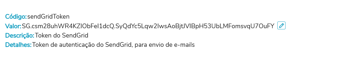 | Detalhes: | Token de autenticação do SendGrid, para envio de e-mails |