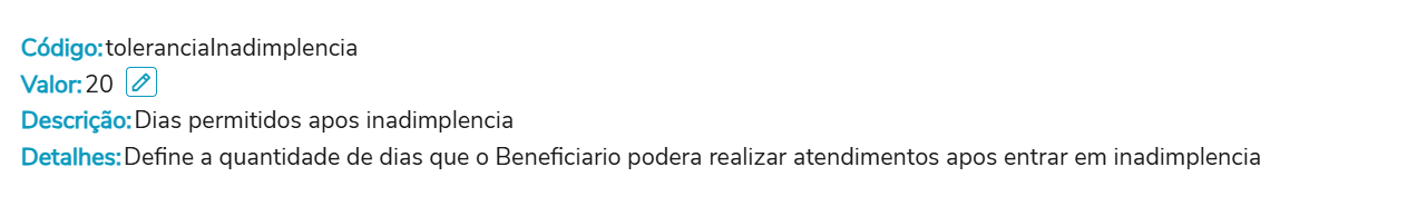 | Detalhes: | Define a quantidade de dias que o Beneficiário poderá realizar atendimentos após entrar em inadimplência |