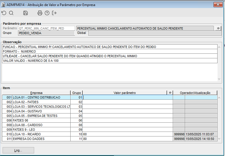 Imagem 1 - Parâmetro empresa QT_PERC_MIN_CANC_ITEM_PED