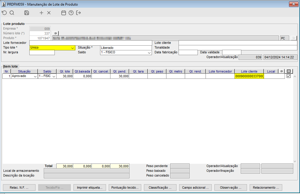Obs: Para produtos que sejam de lote deve-se obrigatoriamente informar o código do lote cliente, não sendo possível informar o código reduzido.