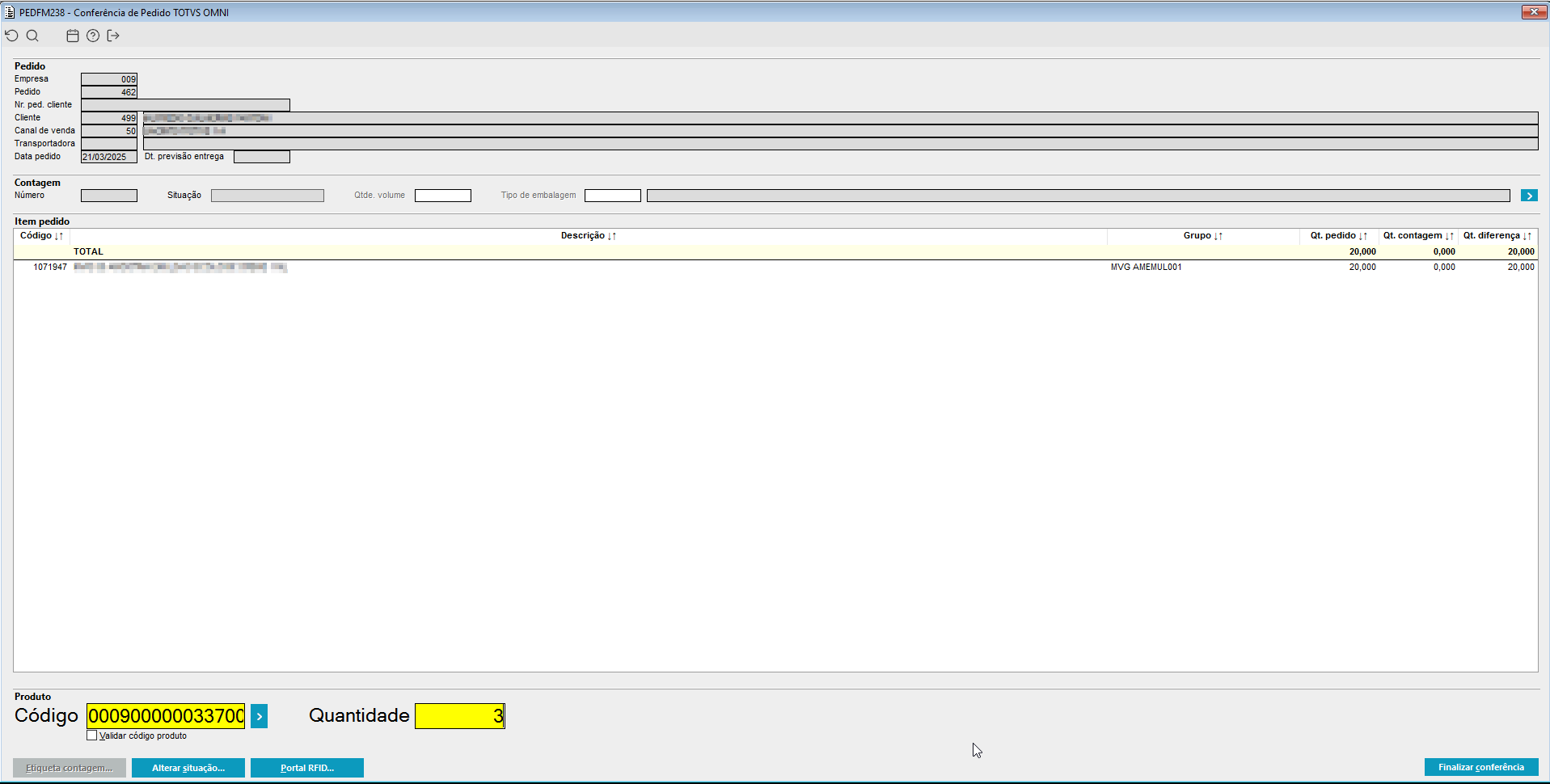 No componente PEDFM238 ao informar o código lote cliente e fazer a conferencia de um item de lote único, o sistema deve lançar 1 item se não informado a quantidade, ou lançar a quantidade de itens informada no campo quantidade.