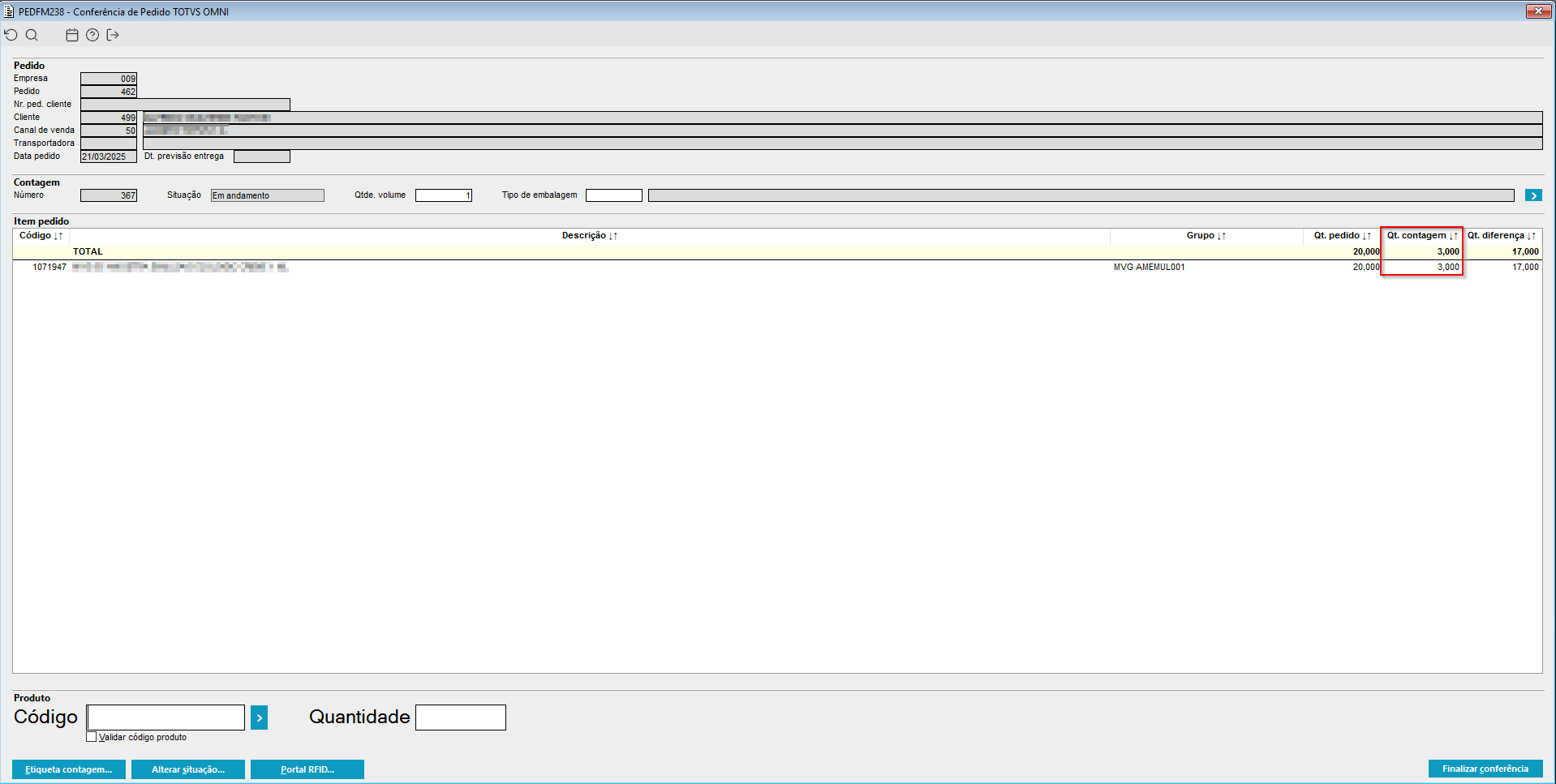 O parâmetro "TP_VALIDA_LOTE_CONTAGEM" deve estar configurado como '1' para que seja validado a quantidade do item de lote.