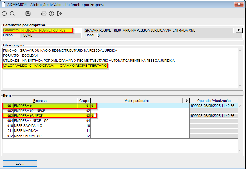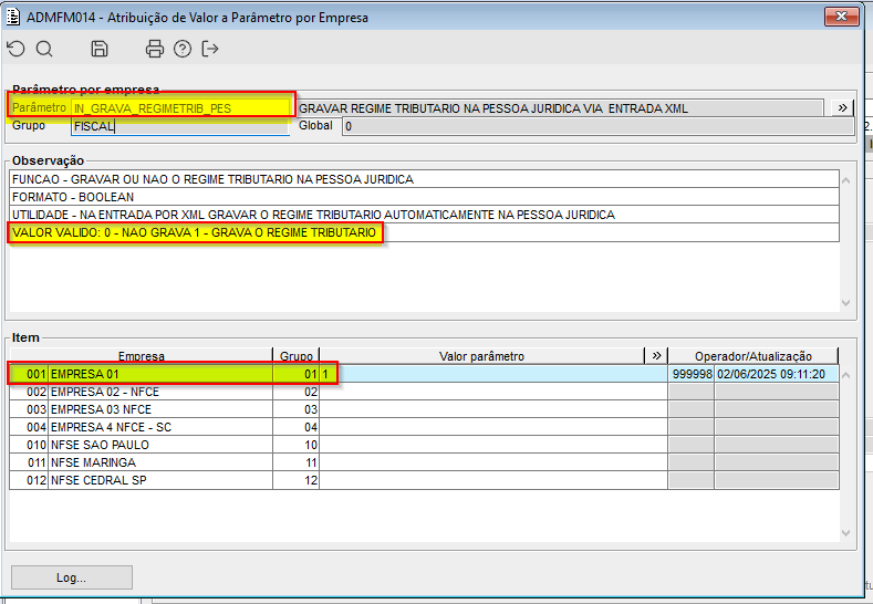 Imagem 01 - Demonstração no ADMFM014 de Atribuição de Valor a Parâmetro por Empresa, com o valor do parâmetro IN_GRAVA_REGIMETRIB_PES = 1.
