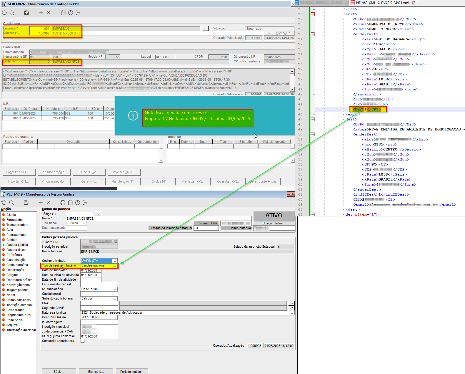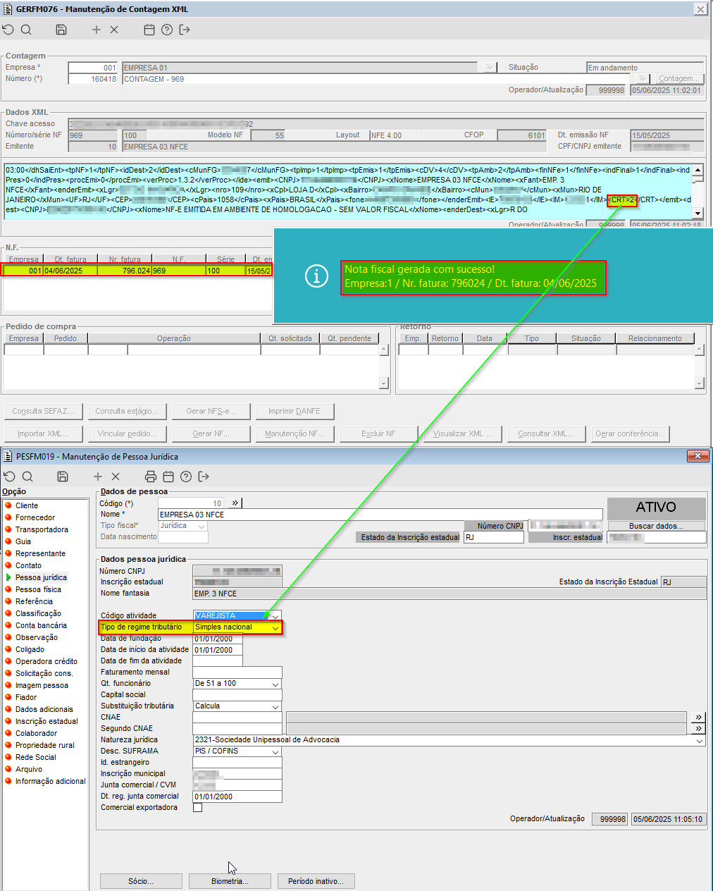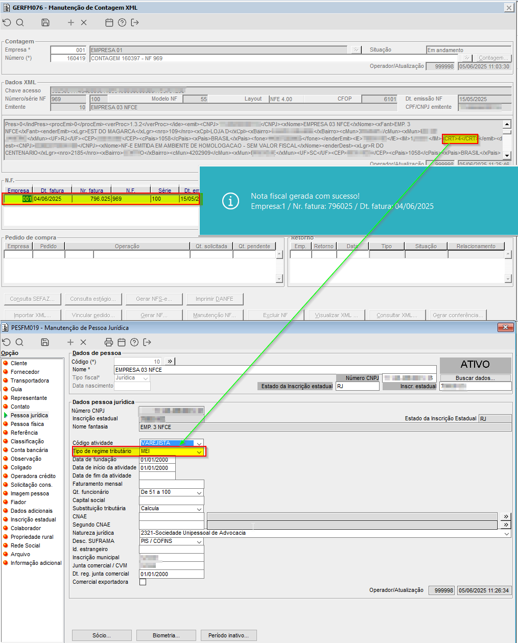 Imagem 05 - Demonstração no GERFM076 de Manutenção de Contagem XML, para importação de um XML com o CRT=4, com o parâmetro IN_GRAVA_REGIMETRIB_PES = 1, gerando no cadastro da pessoa jurídica no campo "Tipo de regime tributário" como "MEI".
