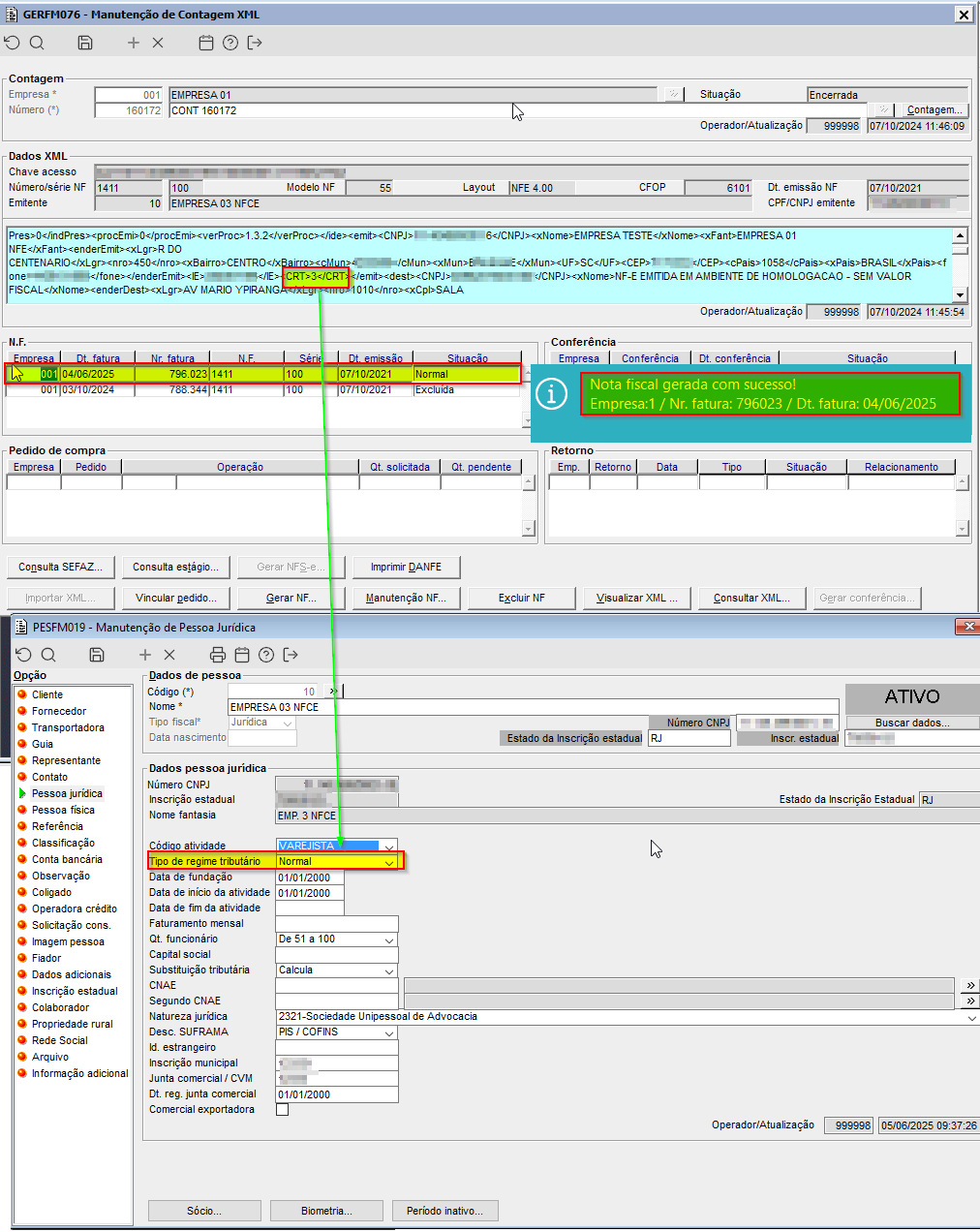 Imagem 04 - Demonstração no GERFM076 de Manutenção de Contagem XML, para importação de um XML com o CRT=3, com o parâmetro IN_GRAVA_REGIMETRIB_PES = 1, gerando no cadastro da pessoa jurídica no campo "Tipo de regime tributário" como "Normal".