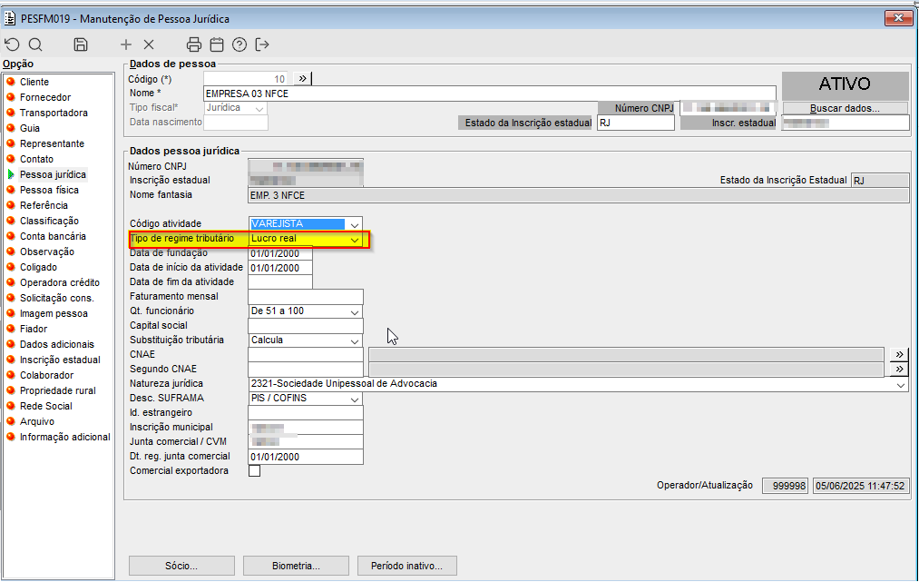 Imagem 07 - Demonstração no PESFM019 de manutenção de Pessoa jurídica com o parâmetro IN_GRAVA_REGIMETRIB_PES = 0 mostrando o tipo de regime tributário = "Lucro real".