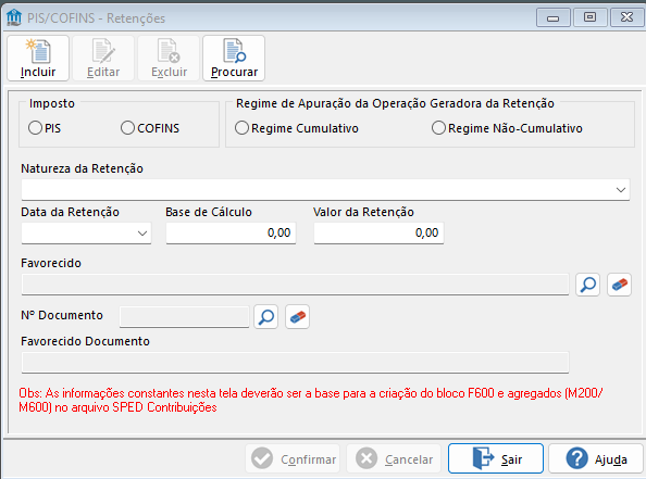 | 4.1 - Retenções Sobre os Serviços Prestados (Regime CUMULATIVO) | Referente retenções do Regime Cumulativo lançados em "PIS/COFINS - Retenções" |