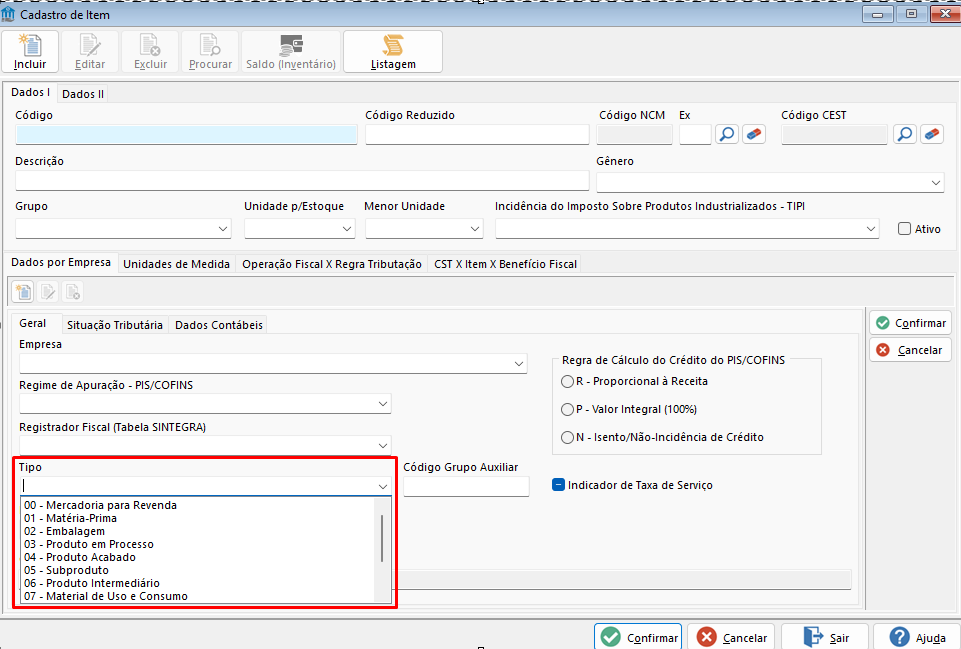 Pode-se verificar o campo "Tipo" na guia Geral da tela Cadastro de Item