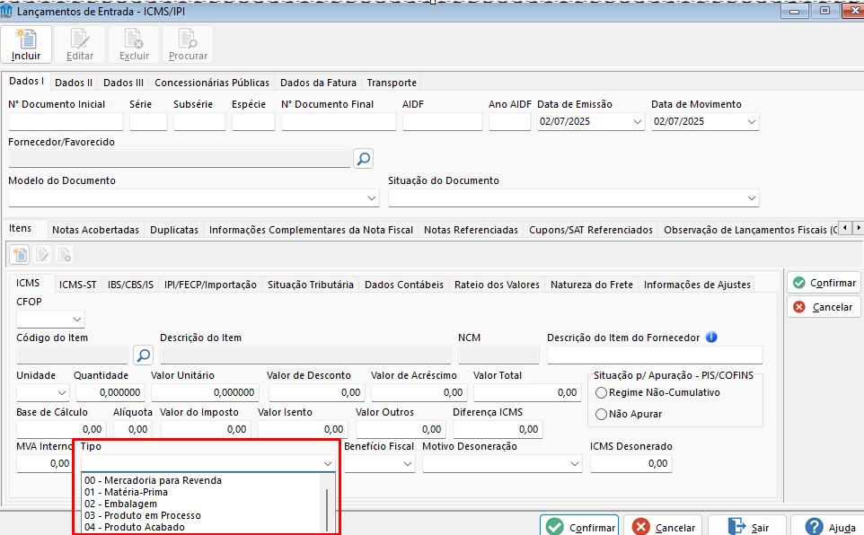 Na tela de Lançamento de Entradas o campo do "Tipo" está localizado na guia ICMS.